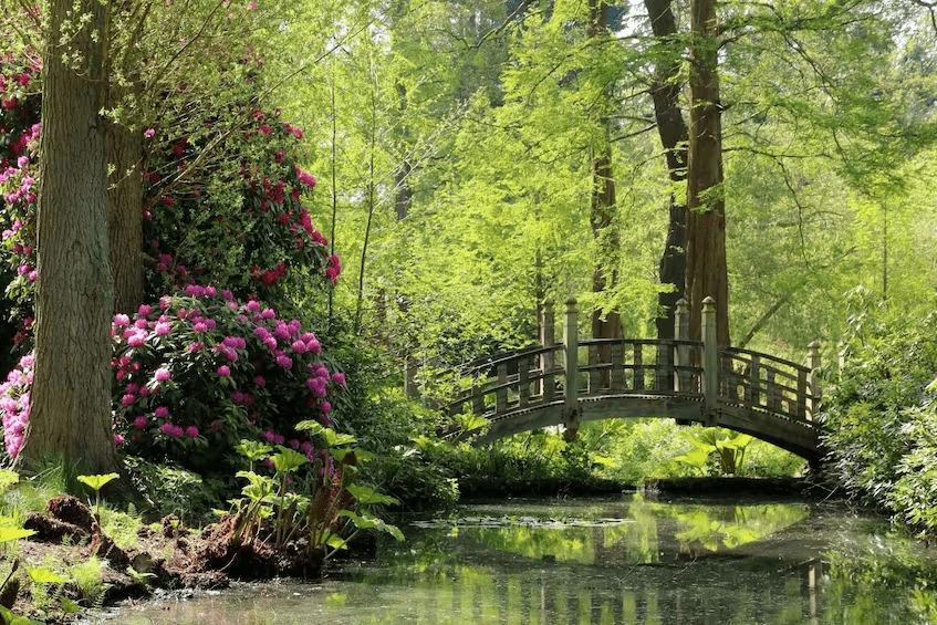 The terrace and front staircase were intended as a transitional space between the residence and nature. Therefore, decorative plants in large and small pots were placed on them. The stairs have been made rounded and they lead directly to the lawn. It was often used for picnics and croquet. In 1930, the following owners of the estate built a pergola on the large lawn, which also corresponded to the Arts and Crafts style. It makes you feel comfortable even under the scorching sun because curly plants create shade. The new owners also built a Japanese bridge and a tea house.