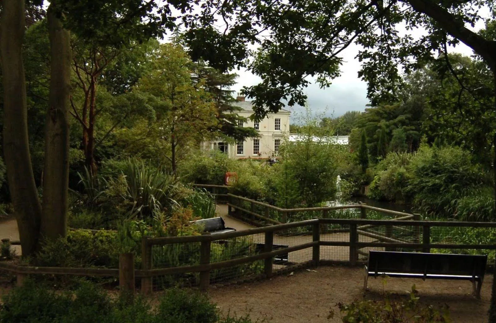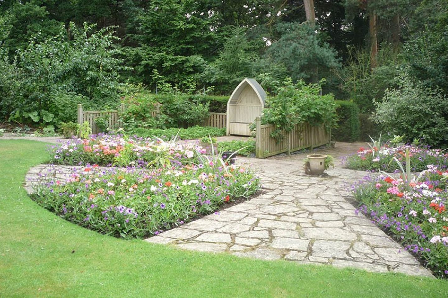 - A rose garden, weeping willow trees, and ornamental borders